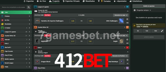 O 412bet oferece uma grande seleção de opções de apostas em e-sports com probabilidades competitivas
